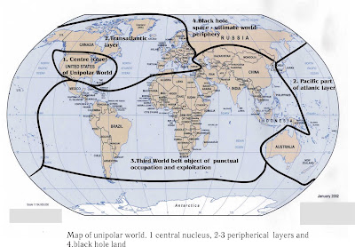Le modèle du monde unipolaire sous domination Américanocentrée (pole OTAN) : – Le filtre “Amérique – Pacifique – Atlantique” (qui équivaut au monde Occidental sous contrôle de l’OTAN). – Le filtre Euraso – Russe” appellé trou noir. (démembrement de l’URSS, anarchie de 1990) – Le filtre 1/3 monde.