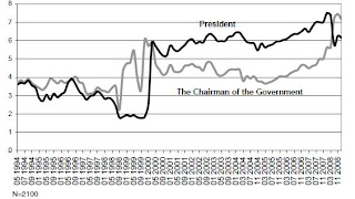 Très logiquement, des 1999-2000 la note est meilleure, les Russes ayant soutenu les actions politiques de leur président. Le schéma témoigne également de la côté de popularité de Vladimir Poutine qui dès début 2008 lorsqu’il passe premier ministre voit la côté de popularité du premier ministre dépasser celle du président.