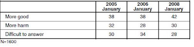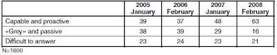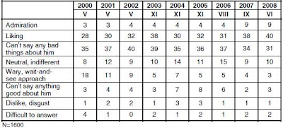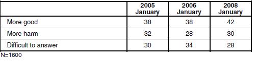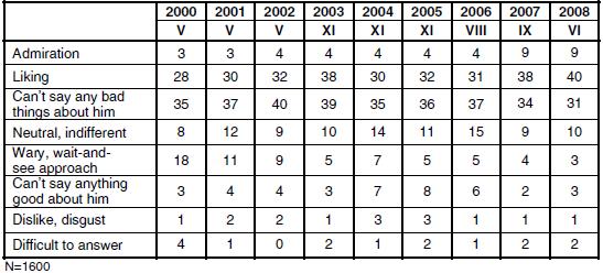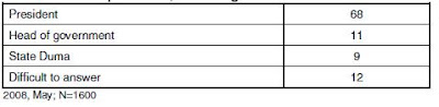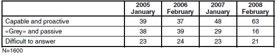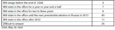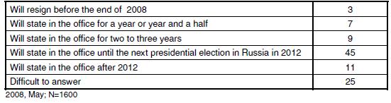 Un nombre croissant de Russes estiment cela positif, 38% en 2005 contre 42% en 2008, de même 60% des sondés soutiennent l’allongement du mandat de 4 à 6 ans et seulement 25% sont contre :