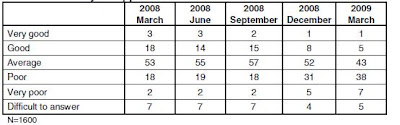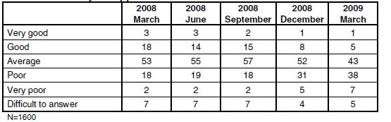 Entre mars 2008 et mars 2009 (soit le coeur de la crise économique mondiale), les mécontents sont passés de 20 à 45% et les satisfaits de 21% à 6%. Ce sondage traduit bien que le peuple Russe exprime ouvertement son mécontentement de la situation, même si il soutient son gouvernement.