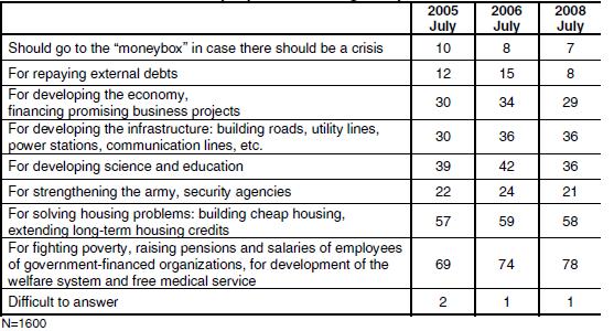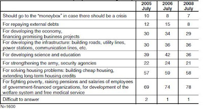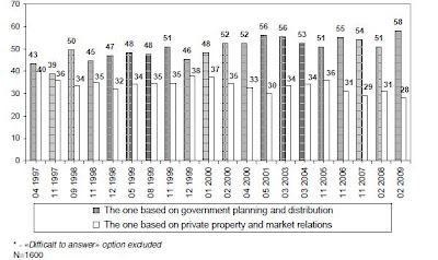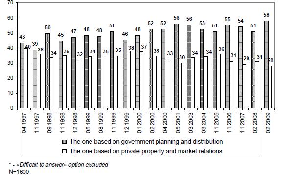 Février 2009 voit le plus haut taux historique de sondés affirmer que le meilleur système est celui des planifications d’états et des distributions d’états, près de 58% contre 48% à la fin du mandat Eltsine. En parallèle, seuls 28% des sondés affirme que le meilleur système est celui basé sur la propriété privée et le marché.