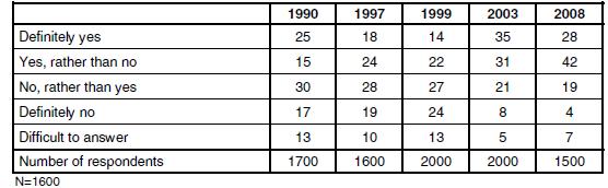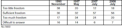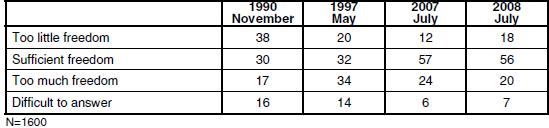 38% des sondés affirmaient manquer de liberté en 1990, ils ne sont plus que 18% en 2008.