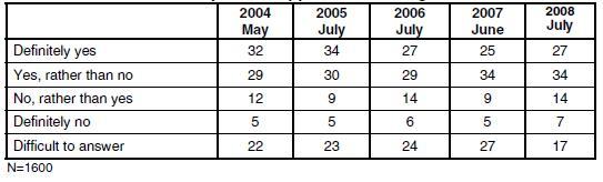 Le taux de sondés qui pensent que la Russie a besoin d’une opposition stagne de 2004 à 2008, il est de 61%