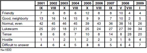 En 2008 9% des russes trouvent la relation plutôt bonne ou amicale, 26% la trouvent normale et 24% l’estime tendue ou hostile.