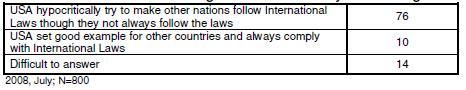 76% des sondés pensent que l’amérique tente hypocritement de faire respecter des règles de droit international aux autres, mais que eux ne respectent pas ces règles.