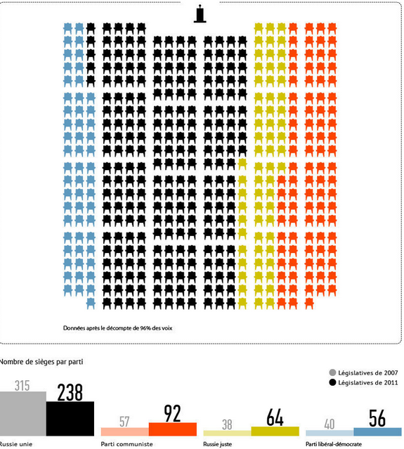 Russie unie recueille 49,3% des voix, le Parti communiste (KPRF) 19,2%, le Parti libéral-démocrate (LDPR) 12,0% et Russie Juste 13,25% des suffrages. Le de participation aux législatives du 4 décembre s’est élevé à 60,2%. 32.348.000 électeurs ont donné leurs voix au parti au pouvoir Russie unie, qui pourrait avoir 238 sièges à la nouvelle Douma. Le KPRF aurait 92 mandats, Russie Juste 64 sièges et le LDPR en obtiendrait 56.