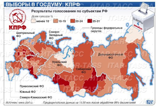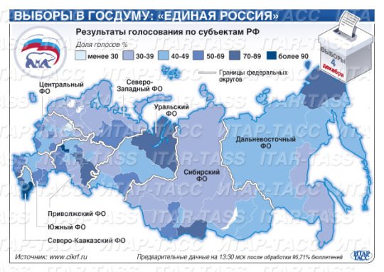 Russie unie recueille 49,3% des voix, le Parti communiste (KPRF) 19,2%, le Parti libéral-démocrate (LDPR) 12,0% et Russie Juste 13,25% des suffrages. Le de participation aux législatives du 4 décembre s’est élevé à 60,2%. 32.348.000 électeurs ont donné leurs voix au parti au pouvoir Russie unie, qui pourrait avoir 238 sièges à la nouvelle Douma. Le KPRF aurait 92 mandats, Russie Juste 64 sièges et le LDPR en obtiendrait 56.