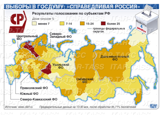 Russie unie recueille 49,3% des voix, le Parti communiste (KPRF) 19,2%, le Parti libéral-démocrate (LDPR) 12,0% et Russie Juste 13,25% des suffrages. Le de participation aux législatives du 4 décembre s’est élevé à 60,2%. 32.348.000 électeurs ont donné leurs voix au parti au pouvoir Russie unie, qui pourrait avoir 238 sièges à la nouvelle Douma. Le KPRF aurait 92 mandats, Russie Juste 64 sièges et le LDPR en obtiendrait 56.