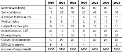 Seulement 7% des Russes citent le manque de droits politiques en 2008, contre 24% en 1998, preuve que la situation s’est considérablement amélioré à ce sujet, contrairement à ce que l’on veut nous faire croire. Enfin 18% des sondés estiment que les gens n’ont pas assez de respect pour leur passé et 21% estime qu’il y a un manque de principes moraux et de valeurs (un taux largement supérieur aux années 90 mais en baisse depuis 2006).